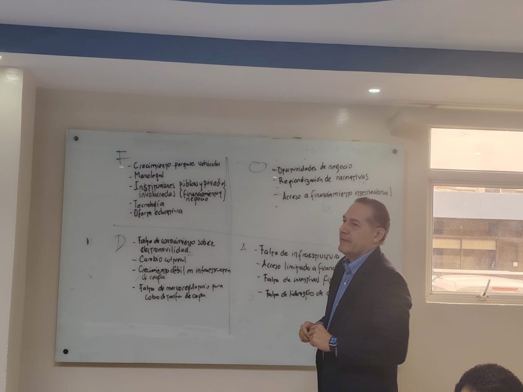 El objetivo principal de la jornada de trabajo era trazar una ruta de avances medibles en movilidad eléctrica, y mediante la realización de una dinámica FODA, lograr identificar las oportunidades actuales y los retas que se enfrentan para una mayor penetración de la movilidad eléctrica en nuestro país.